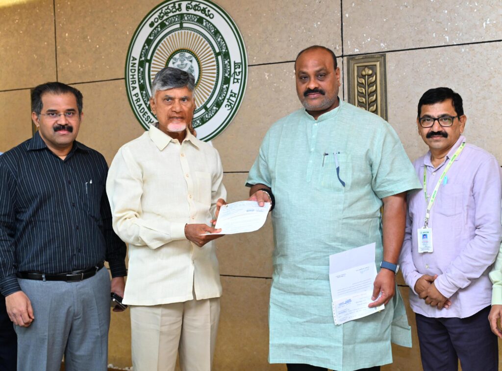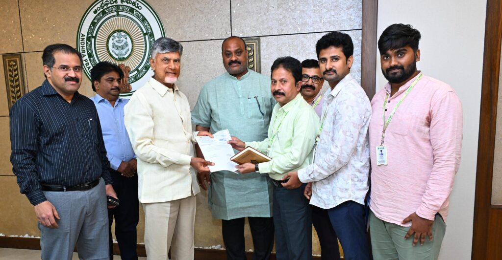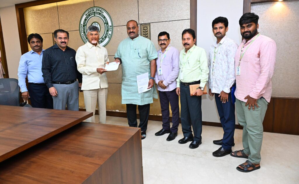 The cheques were presented to the Honorable Chief Minister Sri Nara Chandra Babu Naidu garu in the presence of the Honorable Minister for Agriculture and Cooperation Sri Kinjarapu Atchannaidu garu, ; Chairman of APCOB Sri Babu A, IAS; Managing Director of APCOB Dr. R. S. Reddy; Chief General Managers of APCOB, Sri B. Ramachandraiah and Sri N. Venkataratnam; President of the APCOB Officers’ Association Sri K. L. Naidu and President of the APCOB Staff Union Sri D. Anil Raj, today at the Chief Minister’s Chambers in the AP Secretariat.