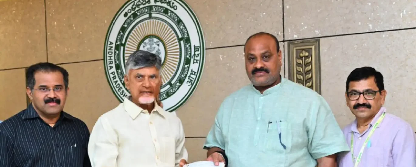 The cheques were presented to the Honorable Chief Minister Sri Nara Chandra Babu Naidu garu in the presence of the Honorable Minister for Agriculture and Cooperation Sri Kinjarapu Atchannaidu garu, ; Chairman of APCOB Sri Babu A, IAS; Managing Director of APCOB Dr. R. S. Reddy; Chief General Managers of APCOB, Sri B. Ramachandraiah and Sri N. Venkataratnam; President of the APCOB Officers’ Association Sri K. L. Naidu and President of the APCOB Staff Union Sri D. Anil Raj, today at the Chief Minister’s Chambers in the AP Secretariat.